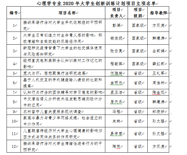 本网讯(教科院18级心理学专业)为创新心理学专业实践教学形式,全面提升学生的专业素养。心理学专业本学期将专业论坛与2020年度大创项目开题相结合,针对2018级心理学专业每一位学生,开展学生选题汇报活动。本年度,2018级心理学专业学生共获批国家级和省级大创项目12项,各项目团队成员基本覆盖该年级的大多数学生。以各立项项目为基础,每两位本科生导师组成一个论坛和开题大组,分组进行了选题和研究设计的汇报展示,部分2019级和2020级心理学专业学生参与了观摩。