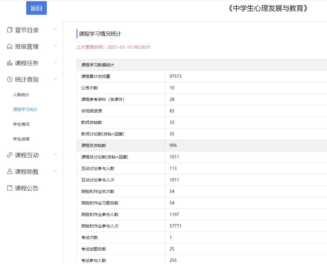 《中学生心理发展与教育》MOOC项目第一个教学运行周期与安徽师范大学2020—2021学年第1学期本科线下教学周期基本保持同步,2020年9月2日正式开始,至2021年1月31日正式结束。项目视频资源时长5小时0分57秒,课程参考资料(含课件)28个,非视频资源83个,测验和作业习题总数54个,技术规范完全参照《安徽省MOOC示范项目课程建设规范及标准》执行。平台累计访问量高达97573次,互动讨论参与人次1011次,课程总讨论数(发帖+回复)1011条,测验和作业参与人次高达57771次,充分体现了课程共享范围广泛,应用模式多样,线上线下应用结合的特点。本教学周期中,实现的线上线下混合教学模式的初步探索,各项教学和考核指标均完全达到省级质量工程MOOC示范项目验收审核标准,基本达到国家精品在线开放课程评选标准。