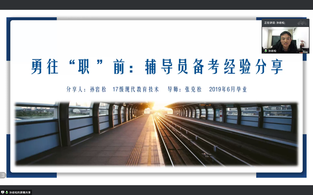 孙岩松学长结合自身求职经历,对辅导员岗位笔试备考和面试经验、入职避坑事项进行了细致的分析和讲解并提出了建议:第一,强化毕业论文“底线思维”,开展系统化、精细化备考,做好持久战心理准备;第二,接受挫折教育,敢于“亮剑”,相信一切皆有可能;第三,注意聘任性质和合同签订,树立“先就业再择业”的观念。