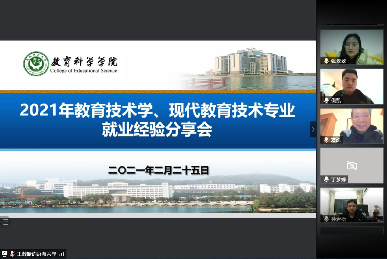 本网讯(文/何玉琪 图/何玉琪)2月25日晚上7点我院举办了2021届教育技术学、现代教育技术专业就业经验分享会。学院党委书记方泓、研究生管理办公室叶方舟老师参加了此次分享会,活动由学院研究生会校友部成员昝雨晴主持,近百名硕士研究生在线参与交流学习。