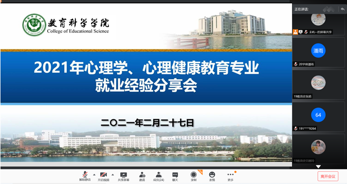 本网讯(文/杨新燕 图/李琴)2月27日下午14:30,我院通过腾讯会议平台举行了2021届心理学、心理健康教育专业就业经验分享会,研究生管理办公室叶方舟老师参加了此次分享会,30余名硕士研究生在线交流学习。本次会议由学院研究生会会务部成员杨霄楠主持。
