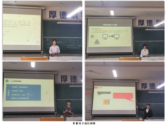 为体现师范生专业能力,提升学生专业素养,本次比赛采用说课(5分钟)和无生授课(15分钟)两种方式进行,9位参赛选手按照赛前抽签顺序依次上场。说课过程中,同学们分别从教材、学情、教法、学法、教学用具、教学过程六个方面熟练、生动地阐述了自己对一节课的理解与设计。讲课环节,各位选手亦是准备充分,目标明确,思路清晰,设计了提问、讨论、答疑等多种课堂活动,充分运用图片、视频、幻灯片等有趣的教学材料,呈现出一节节各具特色的信息技术课程。同学们流畅精炼的语言,优美整洁的板书,端庄大方的仪态,赢得了在场观众与评委老师的阵阵掌声,展现出未来教师的优秀风采。
