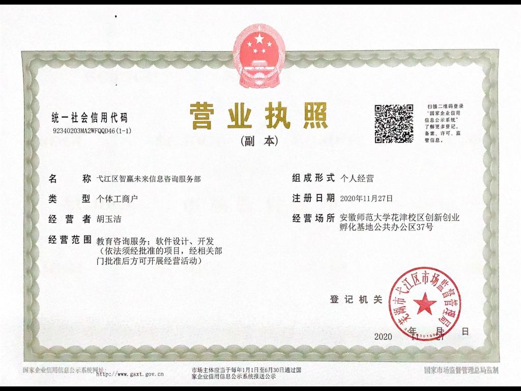 大创立项,创业先行。由青芒创客协会会长胡玉洁主持、18级教育技术学同学参研的《智赢未来STEAM教育工作室》国家级大学生创业项目成功立项,团队成员按照研究计划,积极谋划,稳步推进,并于2020年11月成功申请了“‘智赢未来’STEAM教育工作室”个体工商经营执照,再次实现在校本科生成功创业。工作室以STEAM教育课程服务供给模式探索为主,以青芒创客协会为平台,在指导教师陶佳副教授的教育部重点课题《以高校为中心多方协同的STEAM教育模式研究》支持和引领下扎实推进大创项目研究,工作室主营业务包含STEAM教育课程设计与开发、中小学课后三点半课程服务,青少年科普创意课程开发等,工作室成员专业结构多元,团队人员充足,创业经验丰富,可根据不同学校不同层面的学生需求,个性化定制STEAM教育课程服务。