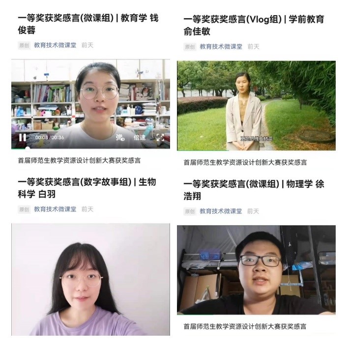 比赛引领,学习创新。师范生教学资源设计创新大赛秉承“以课研学、以赛促学、以学带用、以用促学”的原则,以期在学用结合中提升师范生教学资源设计开发能力,培养具有高尚师德、先进教学理念、精深教学技能的优秀师资力量。首届大赛共有全校11个专业、22个班级、约1280人参加,覆盖面广、参与度高、作品类型丰富,经过激烈角逐,共有微课、数字故事、vlog、ppt课件等128件作品入围决赛。经专家评审,共有来自教育学、学前教育、地理教育、生物教育等多个专业的30件作品分获一二三奖。大赛获奖作品已在专业官微“教育技术微课堂”公众号进行展播,刚推送一周,阅读量最低已达500余次,在校内外师生中引起广泛关注。