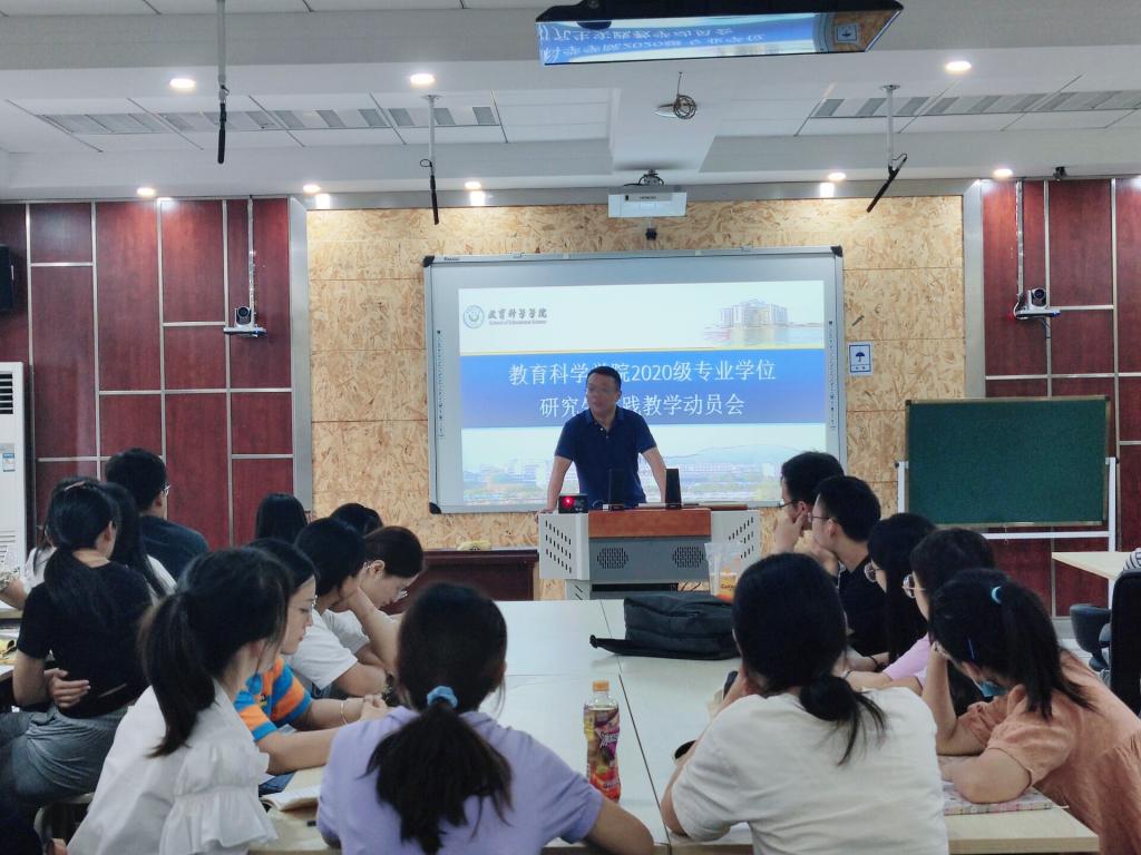 张更立首先强调了实践教学对专业学位研究生实践能力培养的重要意义,他指出实践教学是提升专业学位研究生实践创新能力和未来职业发展能力的重要途径,也是教育硕士培养的重要环节。其次,张更立结合《安徽师范大学全日制教育硕士专业学位研究生实践教学工作实施方案》(校研字[2021]13号)、《365英国上市官网教育硕士专业学位研究生实践教学工作实施细则》(暂行)等文件要求和相关规定向同学们详细介绍了实践教学的时间安排、实践内容以及考核标准等方面的内容。最后,他提醒大家一方面在实践教学中要秉持端正的态度,保持高度的热情和专注,充分做好实践准备;另一方面要牢牢遵守实践单位、学校的疫情防控要求,注意人身安全,定时汇报实践教学动态。