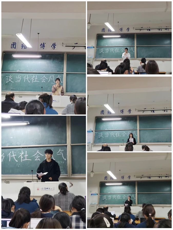 主题演讲活动主要采取班级分组的形式,每班分五组,每组平均十人左右,每周一组轮流进行。21级小教1班各组主要围绕 “青春不息,奋斗不止”、“分享一本书”、“当代大学生如何自我保护”“谈当代社会风气”“人际关系需要断舍离吗”等主题开展。点评老师由王芳、魏晓敏、姚运标、夏益军、白倩、杨俊铨、陈晨、李卯、查小虎、吴颖十位老师组成,他们从演讲内容、语言艺术、仪表姿态、情感渲染等方面对演讲者进行了一一点评,指出学生存在的不足 ,并鼓励学生多锻炼、多尝试、多自信,不断突破自我设限。张琦、高驰、张钰彬、崔中原等学长学姐也依次分享了自己的宝贵经验,给予细心指导。通过两轮的主题演讲活动,同学们的各项能力得到显著提升。也彰显了21级小教1班全体同学的精神风貌和勇气。