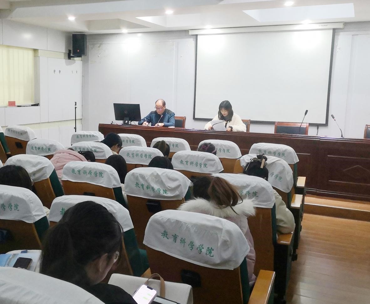 2021年12月14日晚,学院2020级小学教育专业教育硕士实习总结汇报会在教科楼学术交流中心举行。学位点负责人吴支奎教授出席本次汇报会,并担任本次汇报会主持人。小学教育专业37位研究生参与本次实习总结会,3位实习组长就各自小组实习情况做了汇报。
