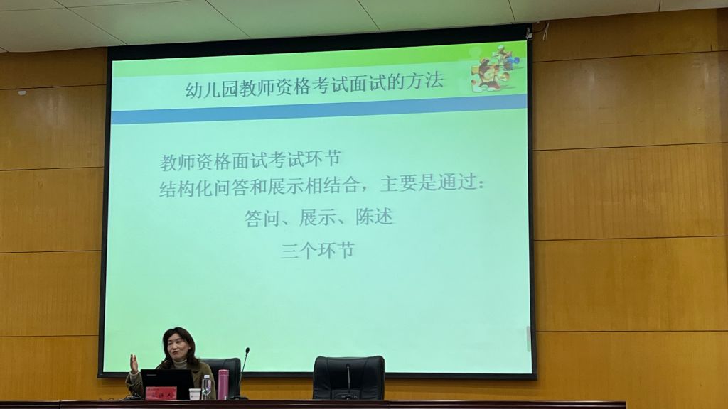 讲座正式开始之前,王路曦老师向同学们介绍了陈海燕老师,使同学们对陈海燕老师有着更进一步的了解。讲座伊始,陈海燕老师从教师资格证面试的环节入手,带领同学们对教资面试的流程有了初步的了解与把握。