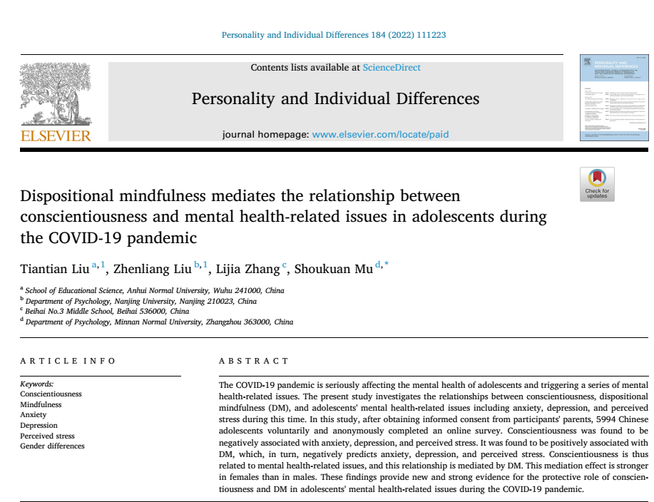 Dispositional mindfulness mediates the relationship between conscientiousness and mental health-related issues in adolescents during the COVID-19 pandemic