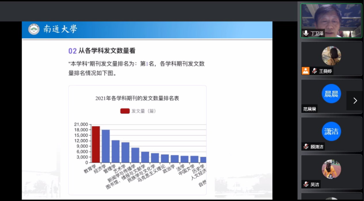 丁教授所作的本次报告选取2021年人文社科领域“教育学”学科的核心期刊共81本,从学科综合数据、内容分析、选题分析三大板块展开论述。首先,他从“本学科”期刊数据、期刊发文数据、期刊中发文作者数据、高校核心期刊数据四大维度进行介绍,阐述期刊发文现状;其次,他向同学们展示了标题、摘要、关键词、框架、参考文献、支持基金数据分析成果;最后,丁教授就学位论文要素中的研究单位、研究维度、限定词、研究理论四大方面进行“选题分析”,并对当下最热的研究方法进行了详细地讲解。
