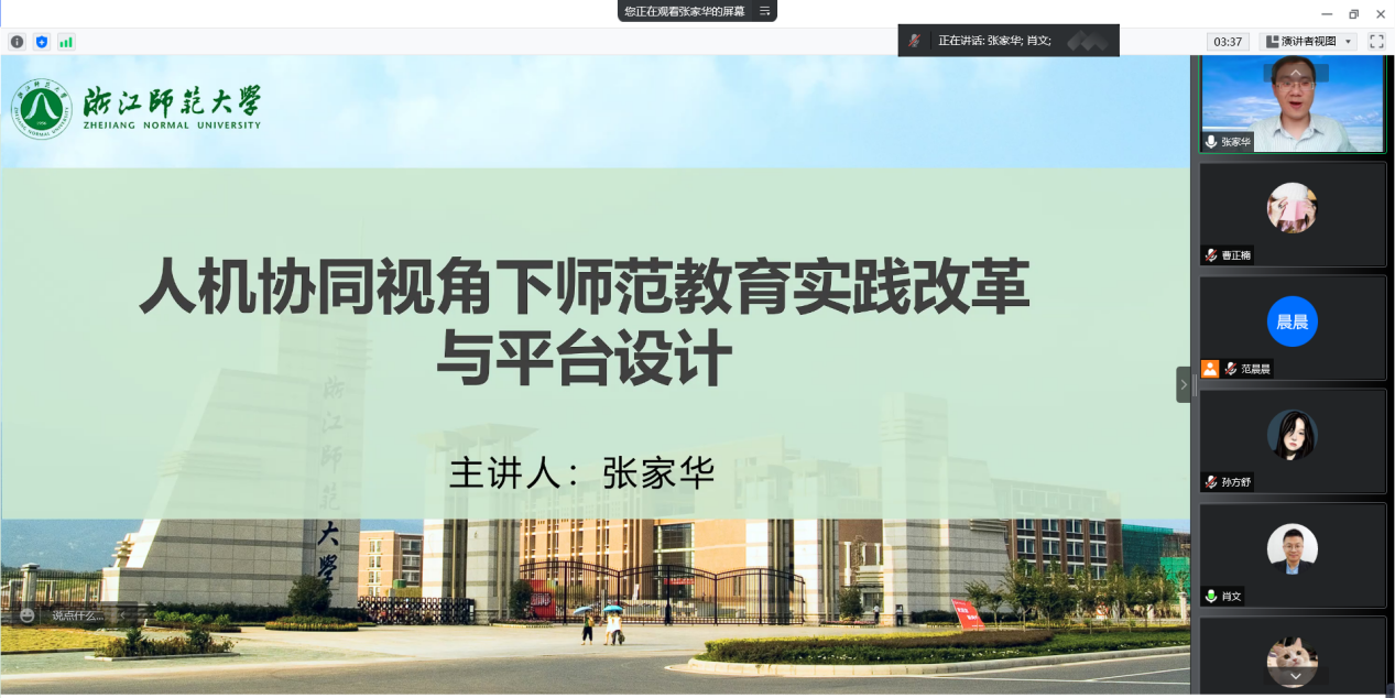 5月23日下午,浙江师范大学教师教育学院教育技术系主任张家华副教授应邀与我院师生开展线上学术交流,并作了题为《人机协同视角下师范教育实践改革与平台设计》的专题讲座。讲座通过腾讯会议举行,由我院教育技术系主任肖文主持,全体教育技术学、现代教育技术专业硕士研究生线上参会。