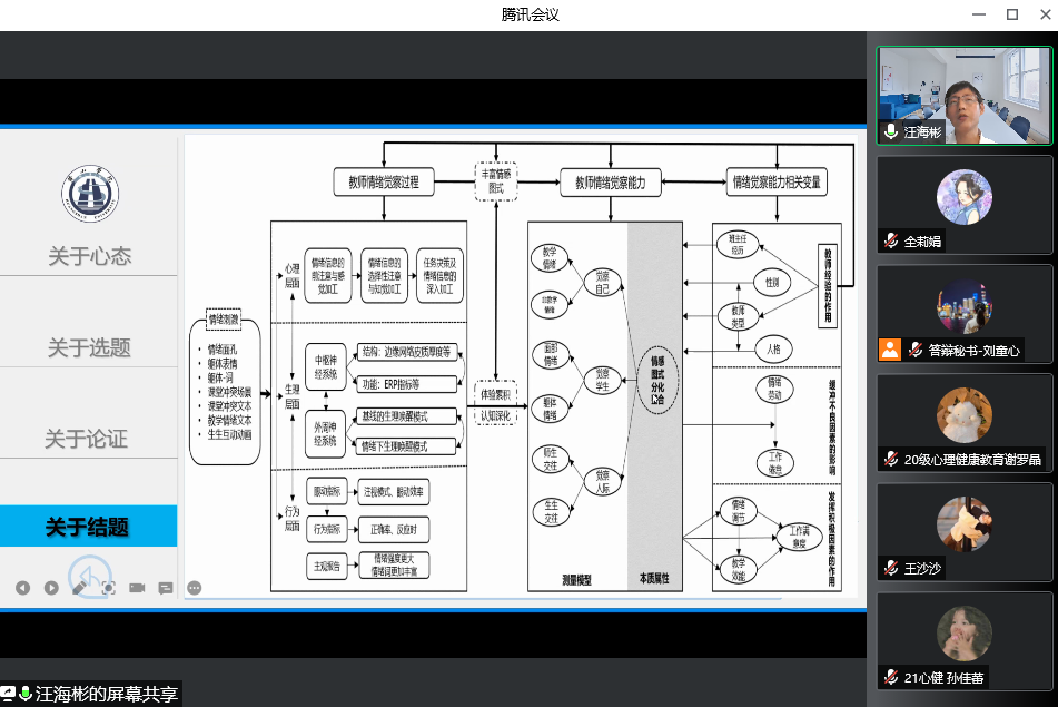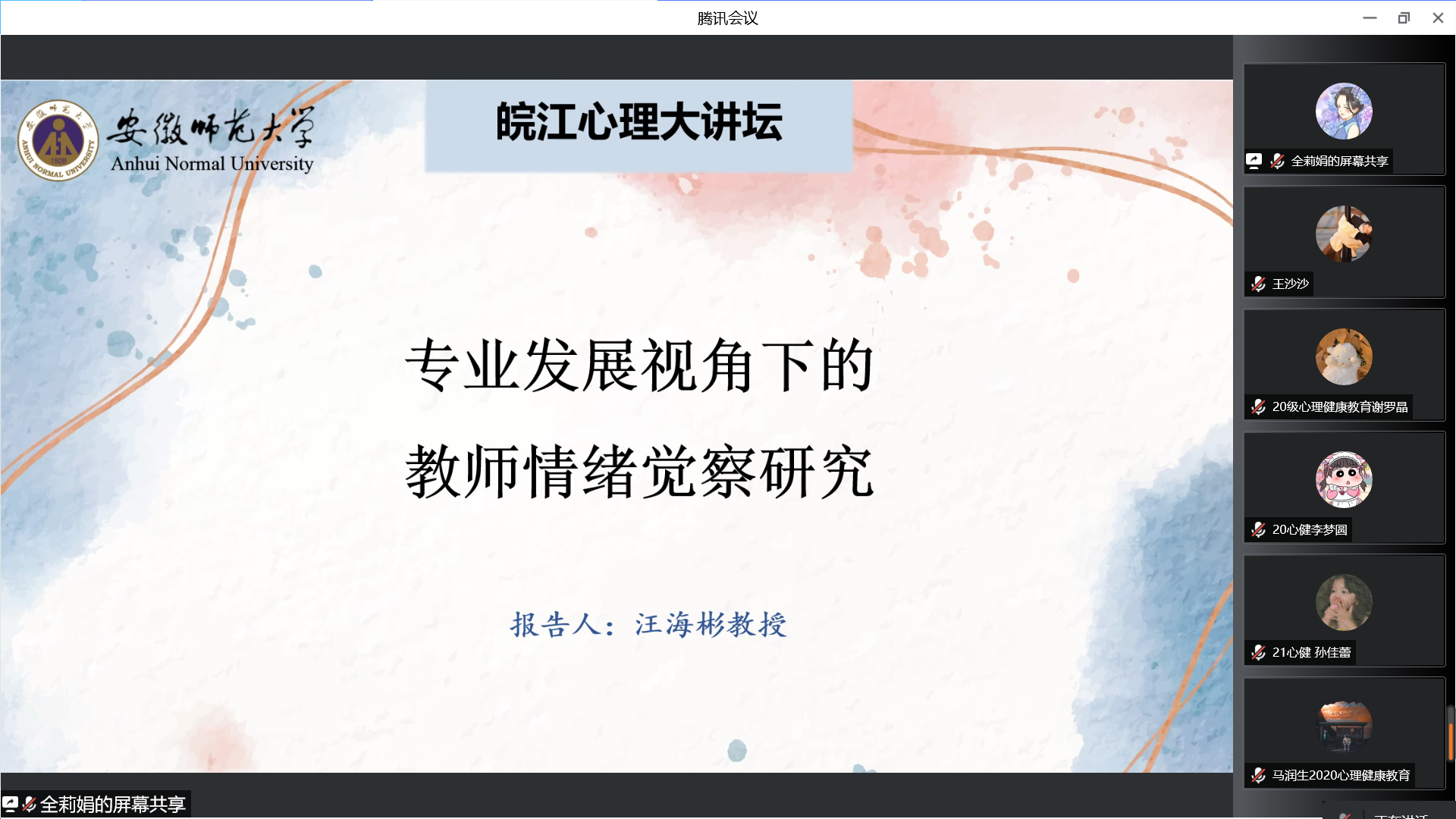 5月28日下午,皖江心理大讲坛第九十二讲邀请到黄山学院365英国上市官网副院长、黄山市教育局副局长汪海彬教授,通过腾讯会议线上开讲的方式,为我院师生作“专业发展视角下的教师情绪觉察研究”的主题讲座。本次讲座由我院心理健康教育专业学位硕士点负责人全莉娟副教授主持,宣宾教授等老师们与2020级和2021级心理健康教育专业的硕士研究生在线参会听讲。