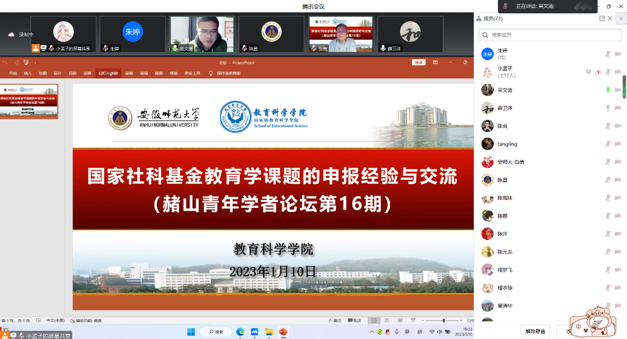 2023年1月10日晚,“赭山青年学者论坛”(第十六期)以线上形式如期开讲。学院特邀教育部人文社会科学重点研究基地西南大学西南民族教育与心理发展中心研究员、西南大学教育学部教授张良,就国家社科基金教育学课题申报进行了经验交流与分享。院长李宜江教授、学校其他学院部分教师、学院青年教师近百人线上参与。分享会由副院长吴文涛主持。