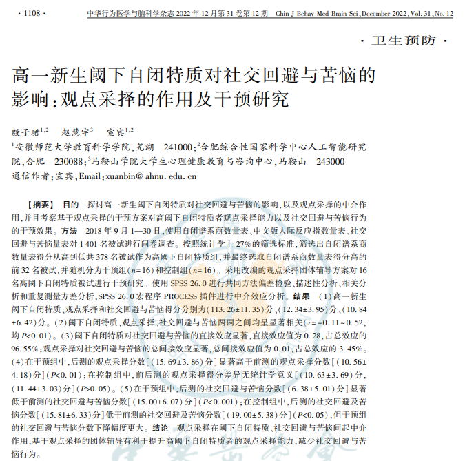 殷子珺,赵慧宇,宣宾:高一新生阈下自闭特质对社交回避与苦恼的影响:观点采择的作用及干预研究