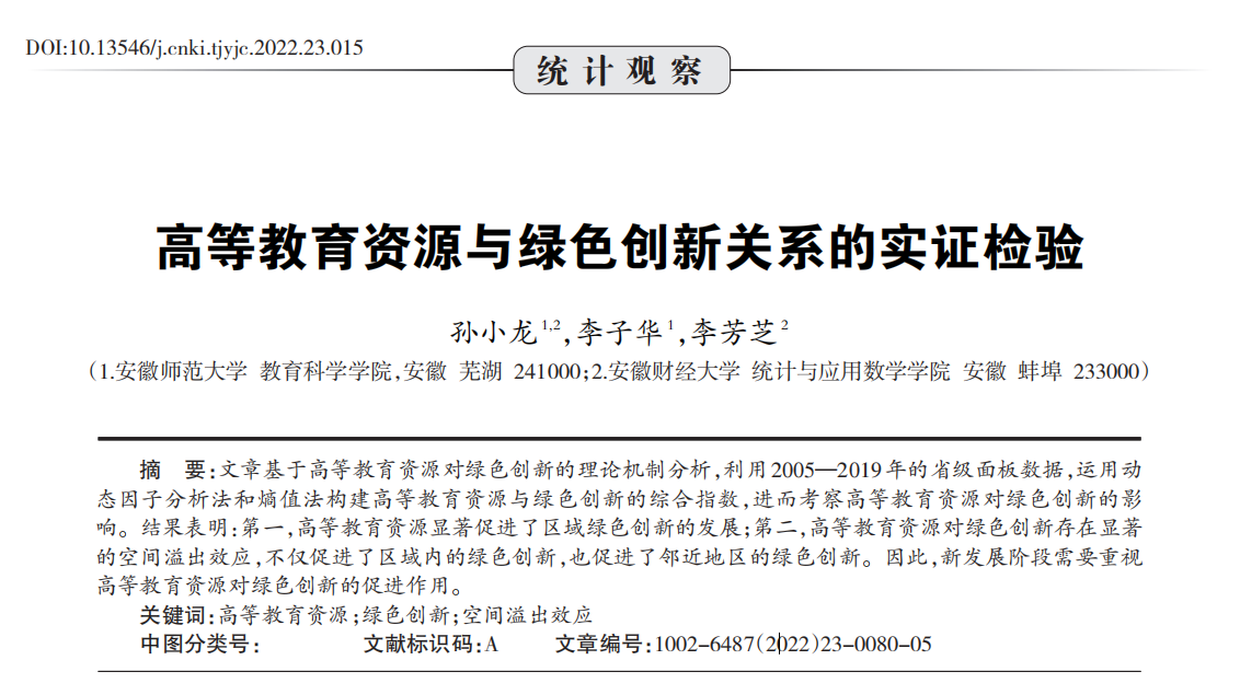 文章基于高等教育资源对绿色创新的理论机制分析,利用2005—2019年的省级面板数据,运用动态因子分析法和熵值法构建高等教育资源与绿色创新的综合指数,进而考察高等教育资源对绿色创新的影响。结果表明:第一,高等教育资源显著促进了区域绿色创新的发展;第二,高等教育资源对绿色创新存在显著的空间溢出效应,不仅促进了区域内的绿色创新,也促进了邻近地区的绿色创新。因此,新发展阶段需要重视高等教育资源对绿色创新的促进作用。
