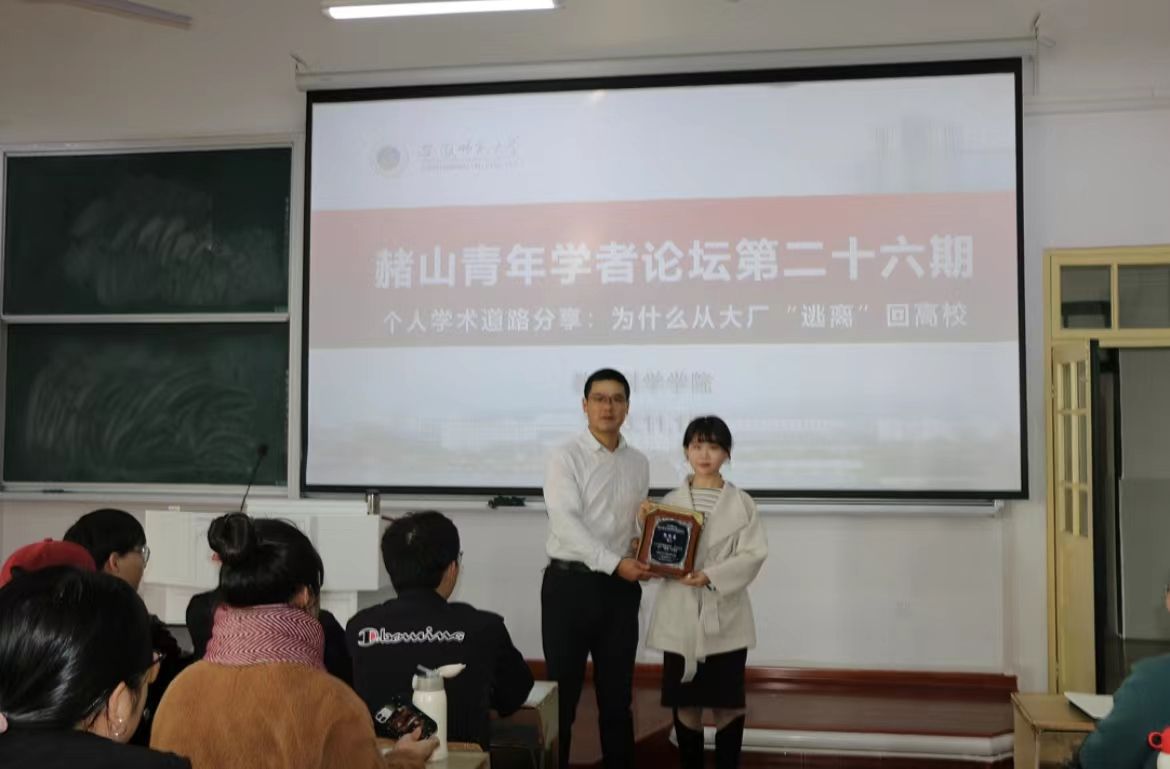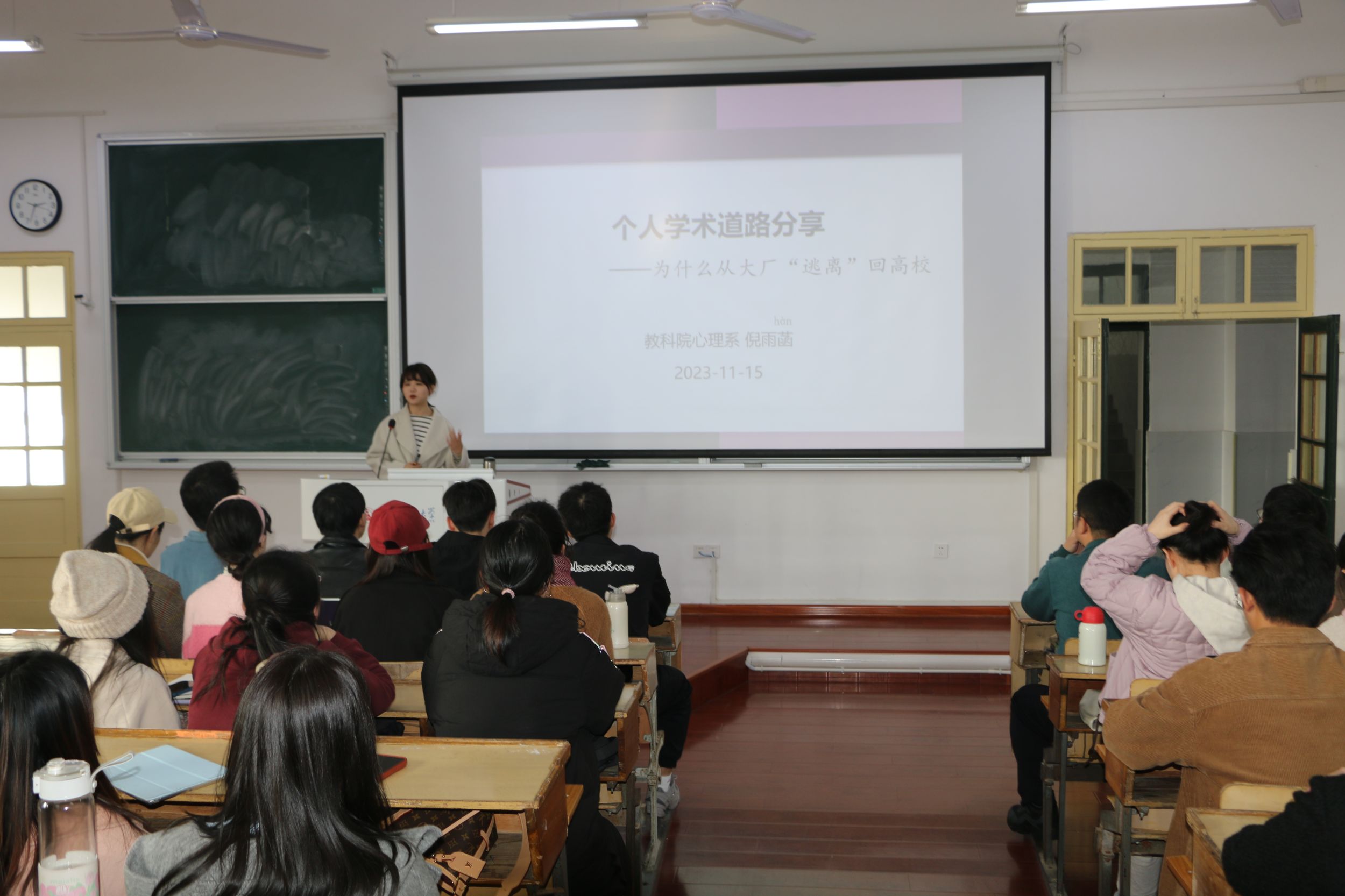 11月15日下午,“赭山青年学者论坛”(第二十六期)在教学楼1401教室如期开讲。青年教师倪雨菡受邀为在场师生带来了主题为《个人学术道路分享:为什么从大厂“逃离”回高校》的学术讲座。副院长吴文涛、辅导员莫大贡、青年教师陈元龙出席了本次讲座,365英国上市官网2023级研究生到场聆听。讲座由2023级研究生陶丽主持。