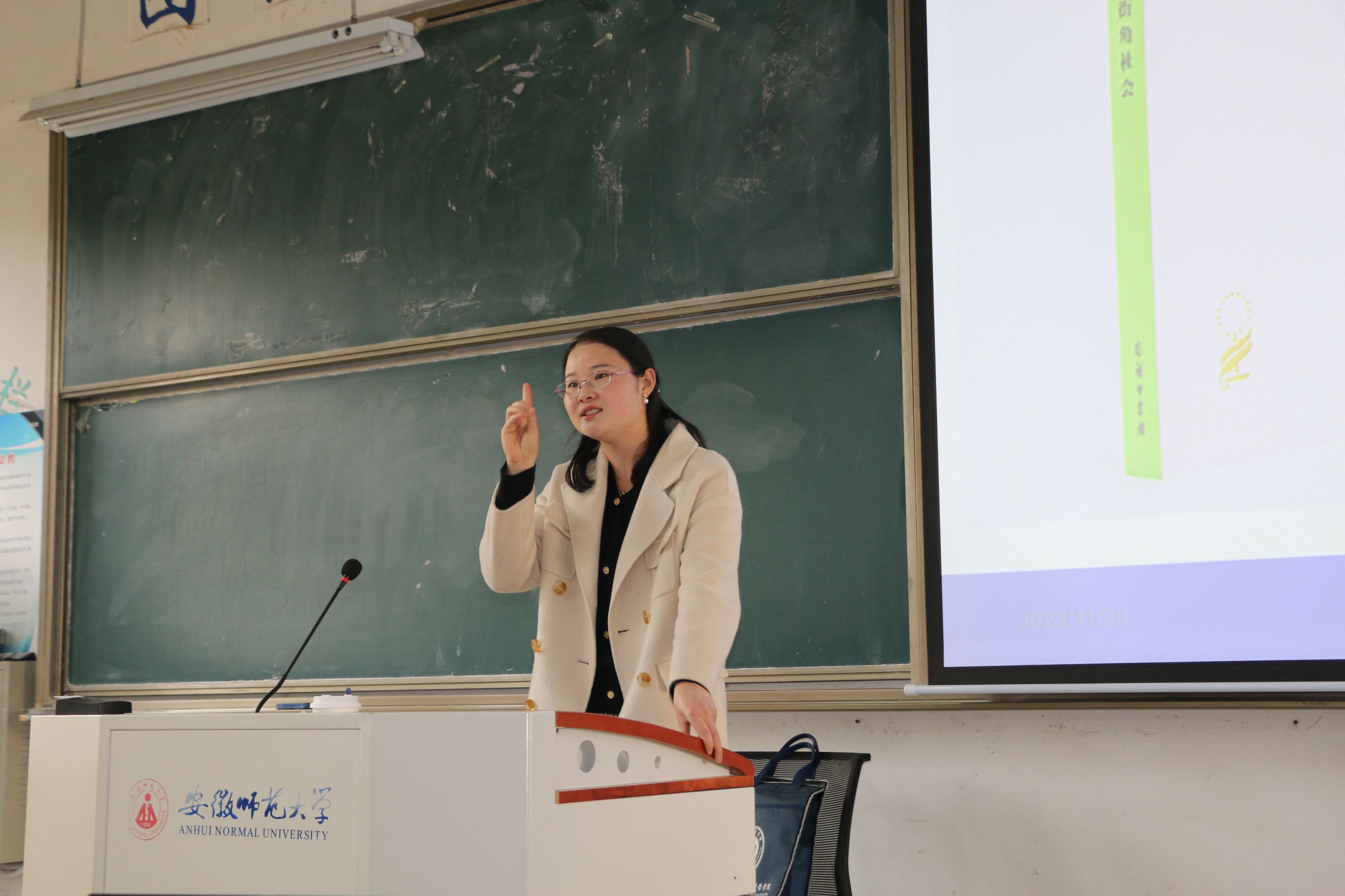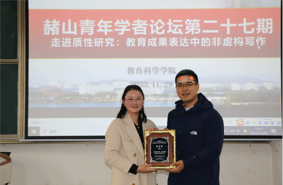 1129午,第二十七“赭山青年学者论坛”在田楼8101教室如期开讲。学院青年教师金马妮受邀为学院师生带来走进质性研究:教育成果表达中的非虚构写作的学术讲座。副院长吴文涛、辅导员莫大贡,2023级教育学、小学教育和学前教育硕士研究生到场聆听讲座由2023级小学教育专业硕士研究生朱建荣同学主持