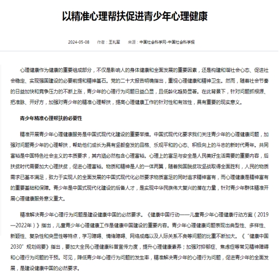 心理健康作为健康的重要组成部分,不仅是影响人的身体健康和全面发展的重要因素,还是构建和谐社会心态、促进社会稳定、实现强国建设的必要前提和精神基石。党的二十大报告明确指出,重视心理健康和精神卫生。然而,随着社会节奏的日益加快和竞争压力的不断上涨,青少年的心理行为问题日益凸显,且低龄化趋势显著。在此背景下,针对问题抓根源、把准脉、开好方,加强对青少年的精准心理帮扶,提高心理健康工作的针对性和有效性,具有重要的现实意义。