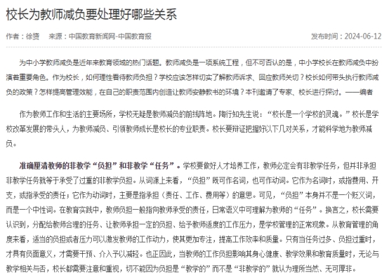 准确厘清教师的非教学“负担”和非教学“任务”。学校要做好人才培养工作,教师必定会有非教学任务,但并非承担非教学任务就等于承受了过重的非教学负担。从词源上来看,“负担”既可作名词,也可作动词。它作为名词时,或指费用、开支,或指承受的责任;它作为动词时,主要是指承担(责任、工作、费用等)的意思。可见,“负担”本身并不是一个贬义词,而是一个中性词。在教育实践中,教师负担一般指向教师承受的责任,日常语义中可理解为教师的“任务”。换言之,校长需要认识到,分配给教师合理的任务、让教师承担一定的负担、给予教师适度的工作压力,是学校管理的正常现象。