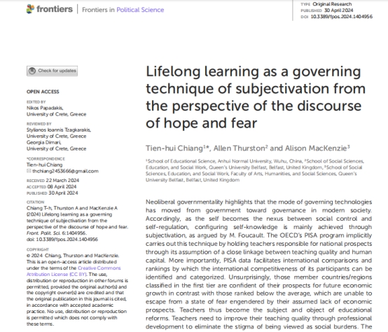 Tien-hui Chiang, Allen Thurston and Alison MacKenzie: Lifelong learning as a governing technique of subjectivation from the perspective of the discourse of hope and fear