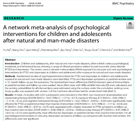 Yu Xie, Xiang Zhu, Lijun Wang, Jiyu Yang: A network meta-analysis of psychological interventions for children and adolescents after natural and man-made disasters