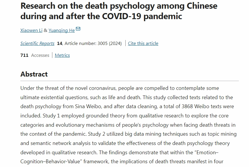 AbstractUnder the threat of the novel coronavirus, people are compelled to contemplate some ultimate existential questions, such as life and death. This study collected texts related to the death psychology from Sina Weibo, and after data cleaning, a total of 3868 Weibo texts were included. Study 1 employed grounded theory from qualitative research to explore the core categories and evolutionary mechanisms of people's psychology when facing death threats in the context of the pandemic. Study 2 utilized big data mining techniques such as topic mining and semantic network analysis to validate the effectiveness of the death psychology theory developed in qualitative research.