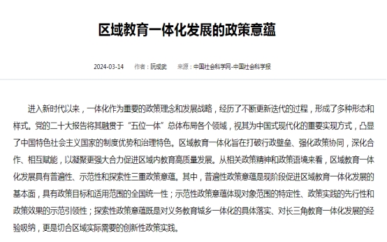 进入新时代以来,一体化作为重要的政策理念和发展战略,经历了不断更新迭代的过程,形成了多种形态和样式。党的二十大报告将其融贯于“五位一体”总体布局各个领域,视其为中国式现代化的重要实现方式,凸显了中国特色社会主义国家的制度优势和治理特色。区域教育一体化旨在打破行政壁垒、强化政策协同,深化合作、相互赋能,以凝聚更强大合力促进区域内教育高质量发展。从相关政策精神和政策语境来看,区域教育一体化发展具有普遍性、示范性和探索性三重政策意蕴。其中,普遍性政策意蕴是现阶段促进区域教育一体化发展的基本面,具有政策目标和适用范围的全国统一性;示范性政策意蕴体现对象范围的特定性、政策实践的先行性和政策效果的示范引领性;探索性政策意蕴既是对义务教育城乡一体化的具体落实、对长三角教育一体化发展的经验吸纳,更是切合区域实际需要的创新性政策实践。