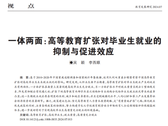 吴颖、李西顺:一体两面:高等教育扩张对毕业生就业的抑制与促进效应