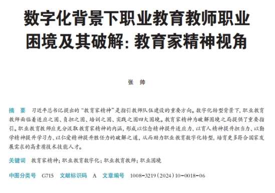 2023 年 9 月 9 日,在第 39 个教师节到来之际,习近平总书记致信全国优秀教师代表座谈会与会代表,在信中首次提出中国特有的教育家精神。就职业教育而言,教育家精神承继优秀师道传统,承载职业教育使命担当,引领“双师型”教师队伍建设。而面对职业教育深层困境,尤其需要教育家精神。