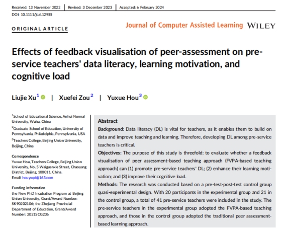 Liujie Xu, Xuefei Zou, Yuxue Hou: Effects of feedback visualisation of peer-assessment on pre-service teachers' data literacy, learning motivation, and cognitive load