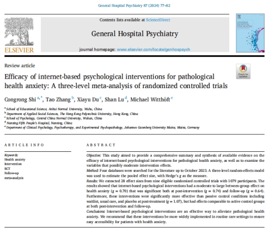 Congrong Shi, Tao Zhang, Xiayu Du, Shan Lu and Michael Witthöft: Efficacy of internet-based psychological interventions for pathological health anxiety: A three-level meta-analysis of randomized controlled trials