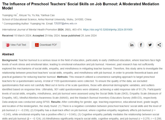 Yuanqing HeXinyue YuYu XiaYanhua CaoThe Influence of Preschool Teachers’ Social Skills on Job Burnout: A Moderated Mediation Model