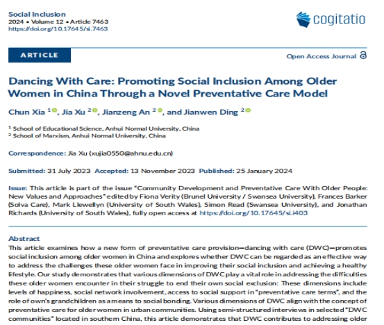 Chun Xia, Jia Xu, Jianzeng An and Jianwen Ding: Dancing With Care: Promoting Social Inclusion Among Older Women in China Through a Novel Preventative Care Model