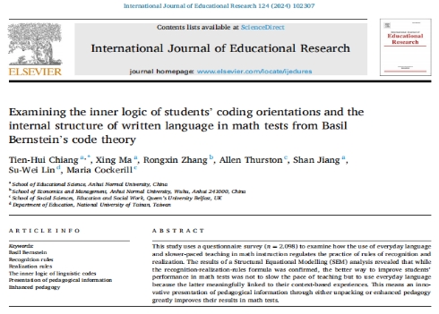 Tien-Hui Chiang, Xing Ma, Rongxin Zhang, Allen Thurston, Shan Jiang, Su-Wei Lin, Maria CockerillExamining the inner logic of students’ coding orientations and the internal structure of written language in math tests from Basil Bernstein’s code theory