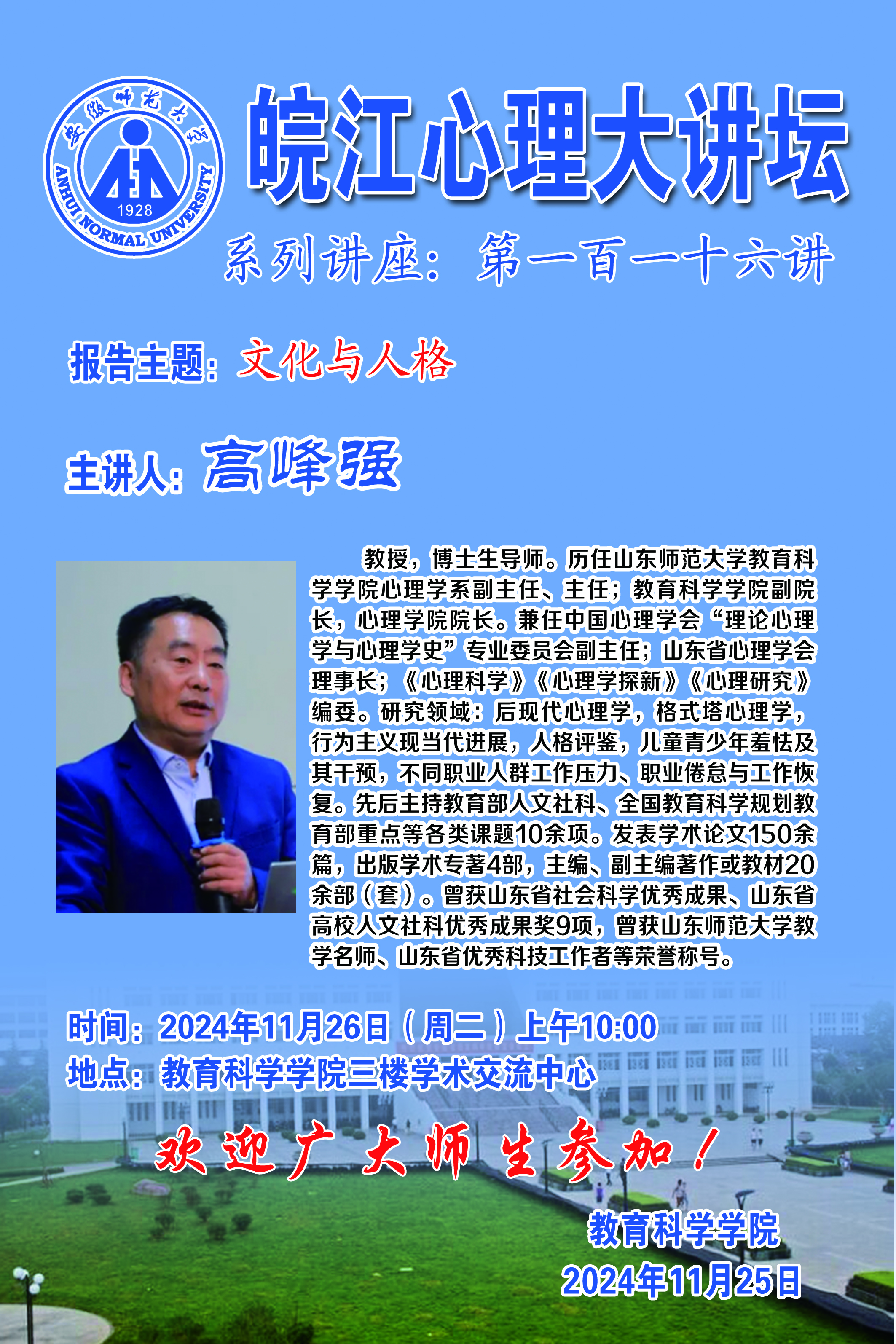 【学术预告】皖江心理大讲坛第一百一十六讲——高峰强:文化与人格