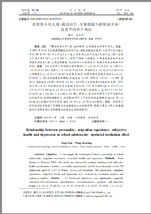 董丹,王道阳:在校青少年人格、流动经历、主观健康与抑郁的关系:有调节的中介效应