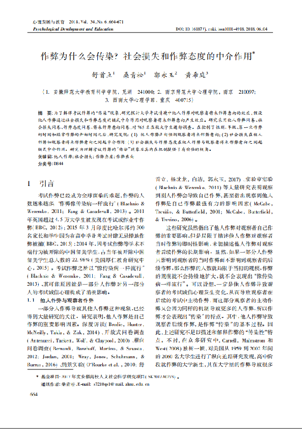 舒首立,桑青松,等:作弊为什么会传染? 社会损失和作弊态度的中介作用