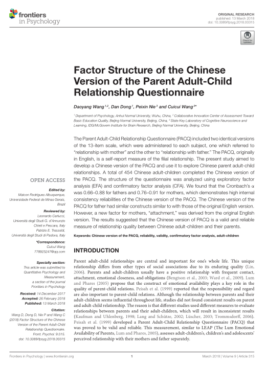 王道阳 等:Factor Structure of the Chinese Version of the Parent Adult-Child Relationship Questionnaire