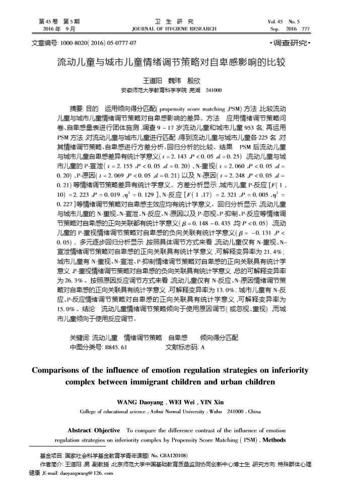 王道阳:流动儿童与城市儿童情绪调节策略对自卑感影响的比较