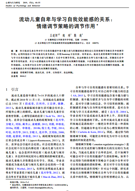 流动儿童自卑与学习自我效能感的关系_情绪调节策略的调节作用_王道阳.pdf