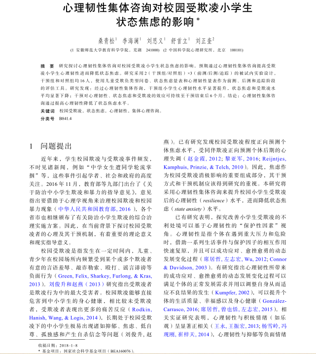 桑青松等:心理韧性集体咨询对校园受欺凌小学生状态焦虑的影响