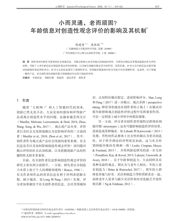 韩建涛:小而灵通,老而顽固?年龄信息对创造性观念评价的影响及其机制