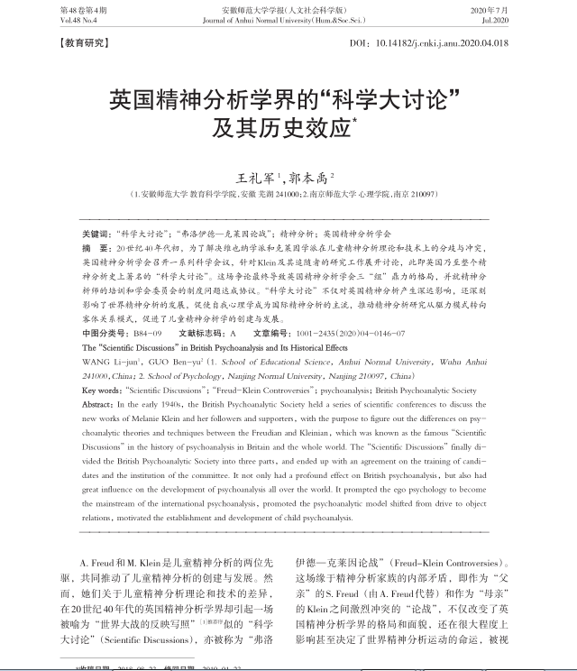 王礼军等:英国精神分析学界的“科学大讨论”及其历史效应