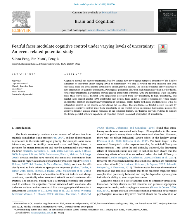 【教师科研】彭苏浩,宣宾:Fearful faces modulate cognitive control under varying levels of uncertainty: