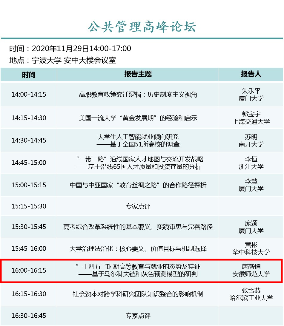 本网讯(教科院)20201228-29日,以“国家治理能力提升和公共管理”为主题的中青年学者甬江国际论坛在宁波大学举行。来自清华大学、香港大学、加利福尼亚大学洛杉矶分校等28所高校的40位博士研究生参加了此次论坛。我院2017级博士研究生唐菡悄在“教育管理与政策”会场做了题为“‘十四五’时期高等教育与就业关系的态势及特征——基于马尔科夫链和灰色预测模型的研判”的学术报告。