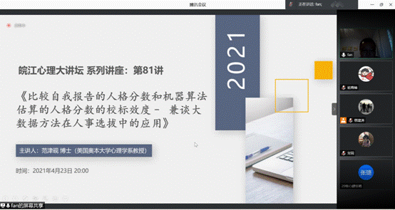 本网讯(文/王薛晴 图/杨霄楠)423日晚,美国奥本大学心理学系教授范津砚博士应邀做客皖江心理大讲坛,为我院师生作题为《比较自我报告的人格分数和机器算法估计的人格分数的校标效度——兼谈大数据方法在人事选拔中的应用》的线上学术讲座。讲座在腾讯会议平台进行,由我院赵必华教授主持,学院心理学等相关专业的教师和研究生共计70余人线上聆听学习。