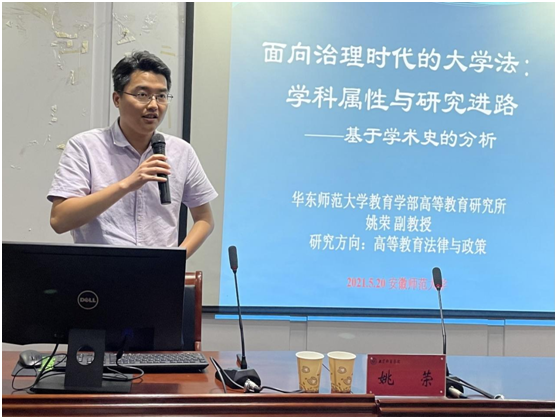 本网讯(教科院 文/图 王薛晴)5月20日下午,华东师范大学教育学部高等教育研究所姚荣副教授应邀来我院,作《面向治理时代的大学法:学科属性与研究进路——基于学术史的分析》主题讲座。本场讲座于我院三楼学术交流中心举行,由我院教育学专业负责人徐赟副教授主持,教育学原理、高等教育学等专业的青年教师、博士和硕士研究生以及教育学本科生到场聆听和学习。