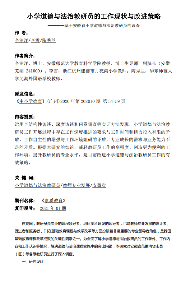 【教师科研】辛治洋等:小学道德与法治教研员的工作现状与改进策略