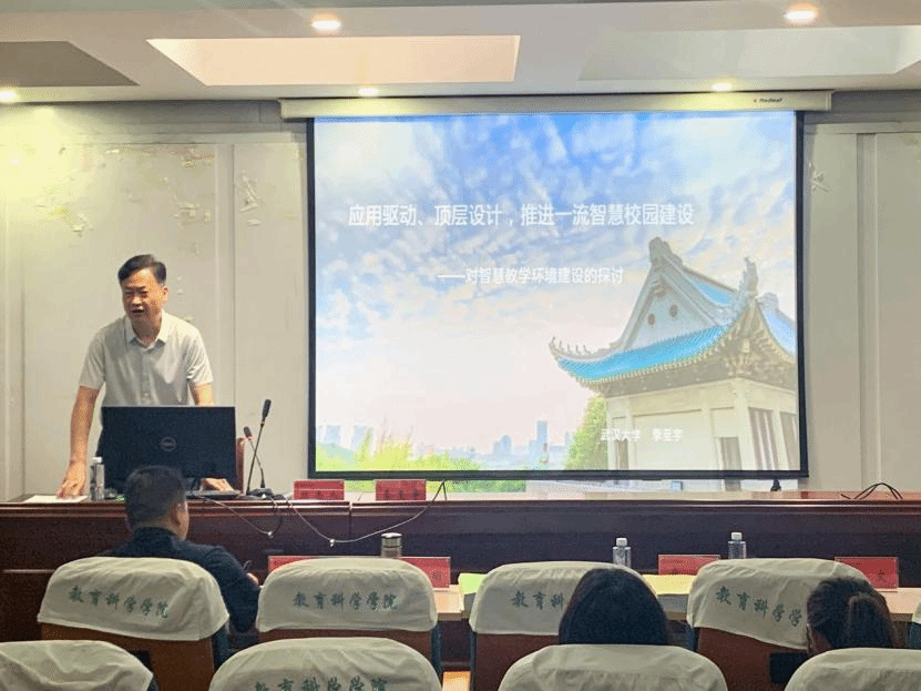 本网讯(教科院 文/谢伟燕 图/康娅婷)5月31日下午,武汉大学教育技术与教学服务中心副主任、高级工程师季至宇应邀来我院作“应用驱动、顶层设计,推动一流智慧校园建设——对智慧教学环境建设的探讨”主题讲座。本次讲座于365英国上市官网三楼学术交流中心举行,由我院教育技术学学位点负责人、博士生导师聂竹明教授主持,教育技术学、现代教育技术等专业研究生到场聆听和学习。