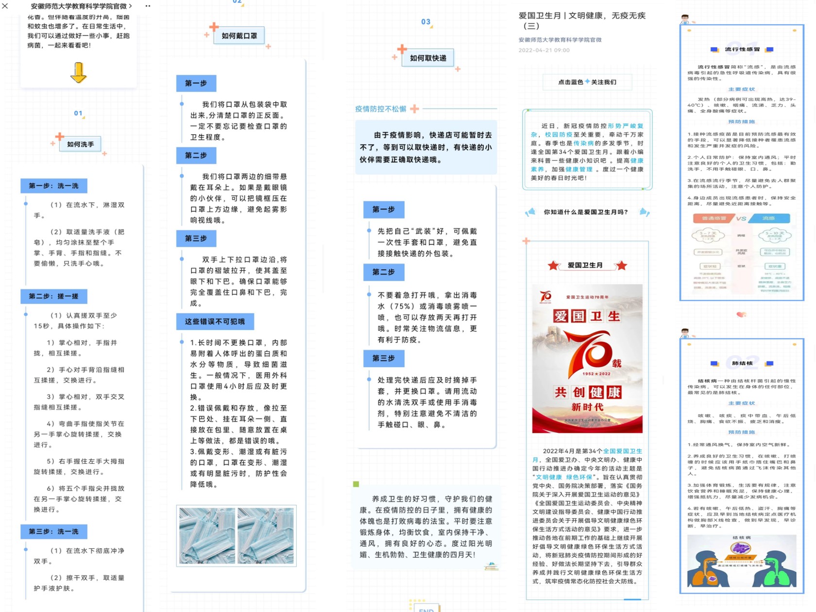 为提升教科学子的卫生文明意识,强化卫生科学知识的普及,教科院通过官Q、微信推文的方式进行爱国卫生月科普宣传。其中,官Q发表肺结核预防措施、虫媒病毒科普知识以及新冠肺炎防控妙招,助力同学们形成良好卫生习惯,加强自身防护;微信公众号发布“文明健康、无疫无疾”爱国卫生月相关微信推文,开展疫情相关知识普及活动,提高同学们文明与健康意识。相关科普宣传致力于深化同学们注重卫生的素养,加强自身健康管理,掀起了爱国卫生月人人参与的浪潮。